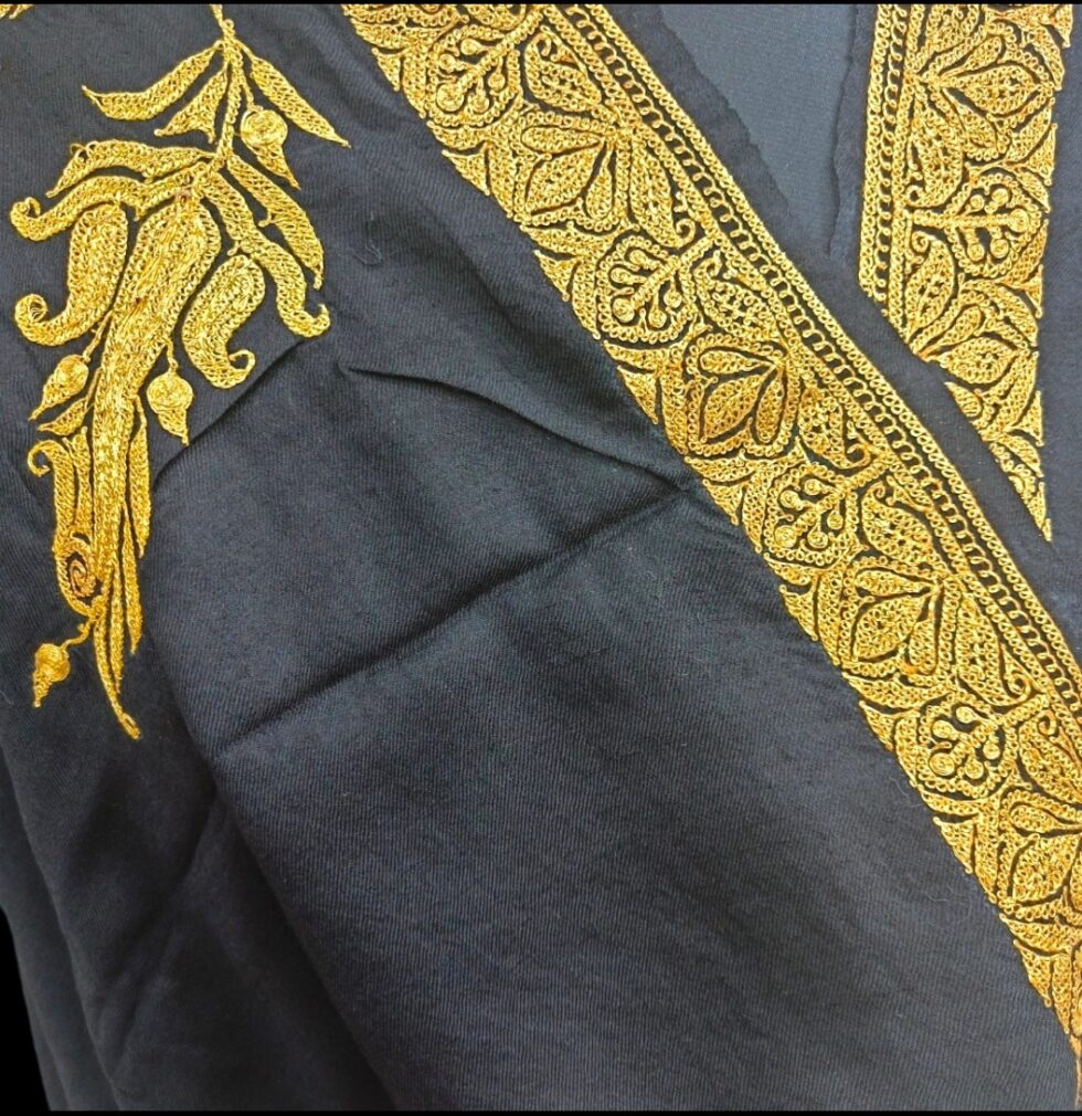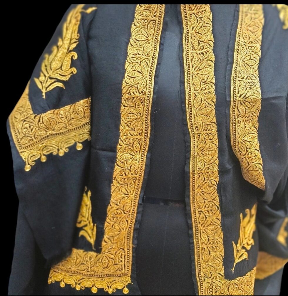 This black pashmina shawl is hand-embroidered with intricate tilla work, showcasing the rich heritage of Kashmiri craftsmanship. It’s a luxurious and timeless accessory for weddings, parties, or special occasions.