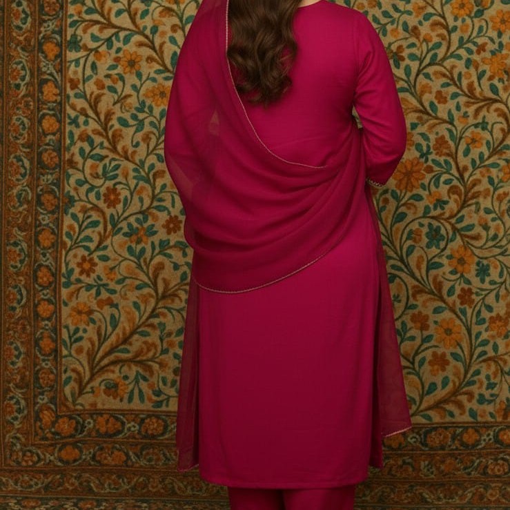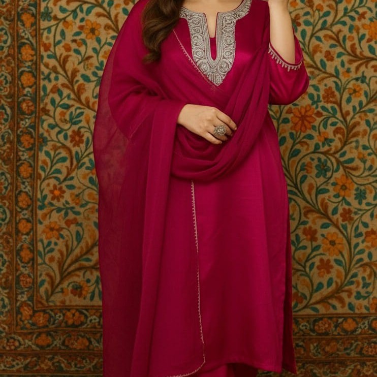 Turn every festive moment into a statement of grace with our Hot Pink Three-Piece Satin Suit—a perfect blend of Kashmiri artistry and modern elegance. The neckline and sleeves are beautifully adorned with handcrafted Tilla Dozi, while the dupatta is finished with a subtle zari kinari, adding just the right touch of shimmer.